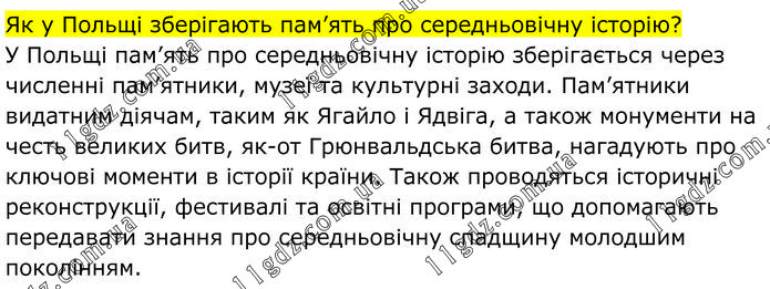 Як у Польщі зберігають пам’ять про середньовічну історію? У Польщі пам’ять про середньовічну історію зберігається через численні пам’ятники, музеї та культурні заходи. Пам’ятники видатним діячам, таким як Ягайло і Ядвіга, а також монументи на честь великих битв, як-от Грюнвальдська битва, нагадують про ключові моменти в історії країни. Також проводяться історичні реконструкції, фестивалі та освітні програми, що допомагають передавати знання про середньовічну спадщину молодшим поколінням.
