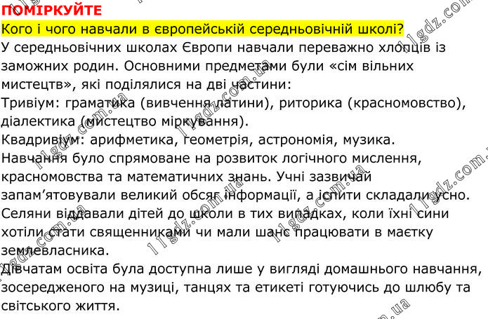 ПОМІРКУЙТЕ Кого і чого навчали в європейській середньовічній школі? У середньовічних школах Європи навчали переважно хлопців із заможних родин. Основними предметами були «сім вільних мистецтв», які поділялися на дві частини: Тривіум: граматика (вивчення латини), риторика (красномовство), діалектика (мистецтво міркування). Квадривіум: арифметика, геометрія, астрономія, музика. Навчання було спрямоване на розвиток логічного мислення, красномовства та математичних знань. Учні зазвичай запам’ятовували великий обсяг інформації, а іспити складали усно. Селяни віддавали дітей до школи в тих випадках, коли їхні сини хотіли стати священниками чи мали шанс працювати в маєтку землевласника. Дівчатам освіта була доступна лише у вигляді домашнього навчання, зосередженого на музиці, танцях та етикеті готуючись до шлюбу та світського життя.