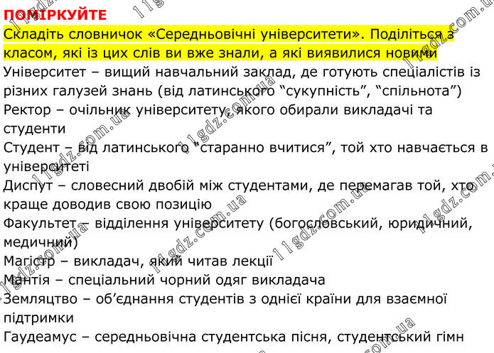 ПОМІРКУЙТЕ Складіть словничок «Середньовічні університети». Поділіться з класом, які із цих слів ви вже знали, а які виявилися новими Університет – вищий навчальний заклад, де готують спеціалістів із різних галузей знань (від латинського “сукупність”, “спільнота”) Ректор – очільник університету, якого обирали викладачі та студенти. Студент – від латинського “старанно вчитися”, той хто навчається в університеті. Диспут – словесний двобій між студентами, де перемагав той, хто краще доводив свою позицію. Факультет – відділення університету (богословський, юридичний, медичний). Магістр – викладач, який читав лекції Мантія – спеціальний чорний одяг викладач.а. Земляцтво – об’єднання студентів з однієї країни для взаємної підтримки. Гаудеамус – середньовічна студентська пісня, студентський гімн.