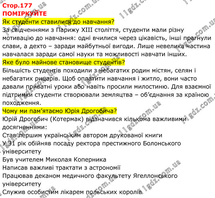 ПОМІРКУЙТЕ Як студенти ставилися до навчання? За свідченнями з Парижу XIII століття, студенти мали різну мотивацію до навчання: одні вчилися через цікавість, інші прагнули слави, а дехто – заради майбутньої вигоди. Лише невелика частина навчалася заради самої науки та можливості навчати інших. Яке було майнове становище студентів? Більшість студентів походили з небагатих родин містян, селян і небагатих рицарів. Щоб оплатити навчання і житло, вони часто давали приватні уроки або навіть просили милостиню. Для взаємної підтримки студенти створювали земляцтва – об’єднання за країною походження. Чому ми пам’ятаємо Юрія Дрогобича? Юрій Дрогобич (Котермак) відзначився кількома важливими досягненнями: Став першим українським автором друкованої книги. У 31 рік обійняв посаду ректора престижного Болонського університету. Був учителем Миколая Коперника. Написав важливі трактати з астрономії. Працював деканом медичного факультету Ягеллонського університету. Служив особистим лікарем польських королів.