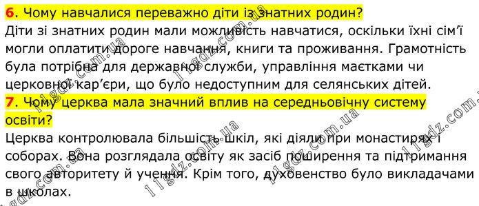 6. Чому навчалися переважно діти із знатних родин? Діти зі знатних родин мали можливість навчатися, оскільки їхні сім’ї могли оплатити дороге навчання, книги та проживання. Грамотність була потрібна для державної служби, управління маєтками чи церковної кар’єри, що було недоступним для селянських дітей. 7. Чому церква мала значний вплив на середньовічну систему освіти? Церква контролювала більшість шкіл, які діяли при монастирях і соборах. Вона розглядала освіту як засіб поширення та підтримання свого авторитету й учення. Крім того, духовенство було викладачами в школах.