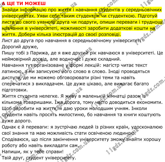 А ЩЕ ТИ МОЖЕШ Знайди інформацію про життя і навчання студентів у середньовічних університетах. Уяви себе таким студентом чи студенткою. Підготуй листа до свого уявного друга чи подруги, опиши переваги і труднощі навчання в університеті, можливості заробити додаткові кошти на життя. Добери кілька ілюстрацій до своєї розповіді. Лист до друга про навчання в середньовічному університеті Дорогий друже, Пишу тобі з Парижа, де я вже другий рік навчаюся в університеті. Це неймовірний досвід, але водночас і дуже складний. Навчання тут організоване у формі лекцій: магістр читає текст латиною, а ми записуємо його слово в слово. Іноді проводяться диспути, де ми можемо обговорювати різні теми та навіть сперечатися з викладачем. Це дуже цікаво, але вимагає багато підготовки. Життя студента нелегке. Я живу в маленькій кімнатці разом із кількома товаришами. Їжа дорога, тому часто доводиться економити. Щоб заробити на життя, я даю уроки молодшим учням. Інколи студенти навіть просять милостиню, бо навчання та книги коштують дуже дорого. Однак є й переваги: я зустрічаю людей із різних країн, удосконалюю свої знання та маю можливість стати освіченою людиною. Сподіваюся, що після закінчення університету зможу знайти хорошу роботу або навіть викладати сам. Напиши, як у тебе справи! Твій друг, студент університету.
