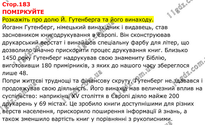 ПОМІРКУЙТЕ Розкажіть про долю Й. Гутенберга та його винаходу. Йоганн Гутенберг, німецький винахідник і видавець, став засновником книгодрукування в Європі. Він сконструював друкарський верстат і винайшов спеціальну фарбу для літер, що дозволило значно прискорити процес друкування книг. Близько 1450 року Гутенберг надрукував свою знамениту Біблію, виготовивши 180 примірників, з яких до нашого часу збереглося лише 48. Попри життєві труднощі та фінансову скруту, Гутенберг не здавався і продовжував свою діяльність. Його винахід мав величезний вплив на суспільство: наприкінці XV століття в Європі діяло майже 200 друкарень у 69 містах. Це зробило книги доступнішими для різних верств населення, прискорило поширення інформації й знань, а також зменшило вартість книг у порівнянні з рукописними.