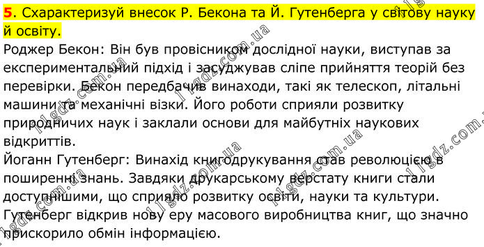 Схарактеризуй внесок Р. Бекона та Й. Гутенберга у світову науку й освіту. Роджер Бекон: Він був провісником дослідної науки, виступав за експериментальний підхід і засуджував сліпе прийняття теорій без перевірки. Бекон передбачив винаходи, такі як телескоп, літальні машини та механічні візки. Його роботи сприяли розвитку природничих наук і заклали основи для майбутніх наукових відкриттів. Йоганн Гутенберг: Винахід книгодрукування став революцією в поширенні знань. Завдяки друкарському верстату книги стали доступнішими, що сприяло розвитку освіти, науки та культури. Гутенберг відкрив нову еру масового виробництва книг, що значно прискорило обмін інформацією.