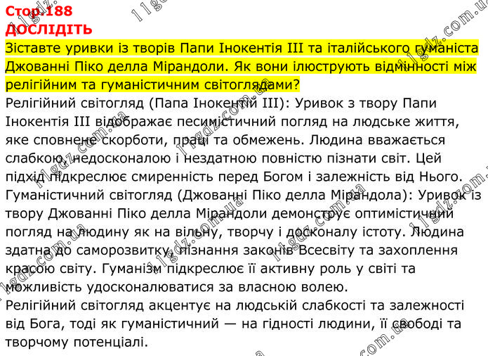 ДОСЛІДІТЬ Зіставте уривки із творів Папи Інокентія ІІІ та італійського гуманіста Джованні Піко делла Мірандоли. Як вони ілюструють відмінності між релігійним та гуманістичним світоглядами? Релігійний світогляд (Папа Інокентій ІІІ): Уривок з твору Папи Інокентія ІІІ відображає песимістичний погляд на людське життя, яке сповнене скорботи, праці та обмежень. Людина вважається слабкою, недосконалою і нездатною повністю пізнати світ. Цей підхід підкреслює смиренність перед Богом і залежність від Нього. Гуманістичний світогляд (Джованні Піко делла Мірандола): Уривок із твору Джованні Піко делла Мірандоли демонструє оптимістичний погляд на людину як на вільну, творчу і досконалу істоту. Людина здатна до саморозвитку, пізнання законів Всесвіту та захоплення красою світу. Гуманізм підкреслює її активну роль у світі та можливість удосконалюватися за власною волею. Релігійний світогляд акцентує на людській слабкості та залежності від Бога, тоді як гуманістичний — на гідності людини, її свободі та творчому потенціалі.