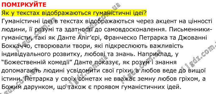 ПОМІРКУЙТЕ Як у текстах відображаються гуманістичні ідеї? Гуманістичні ідеї в текстах відображаються через акцент на цінності людини, її розумі та здатності до самовдосконалення. Письменники-гуманісти, такі як Данте Аліг’єрі, Франческо Петрарка та Джованні Боккаччо, створювали твори, які підкреслюють важливість індивідуального розвитку, любові та знань. Наприклад, у “Божественній комедії” Данте показує, як розум і знання допомагають людині усвідомити свої гріхи, а любов веде до вищої істини. Петрарка у своїх сонетах не вважає земну любов гріхом, а Божим дарунком, що також є проявом гуманістичних ідей.