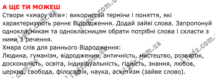 А ЩЕ ТИ МОЖЕШ Створи «хмару слів»: використай терміни і поняття, які характеризують раннє Відродження. Додай зайві слова. Запропонуй однокласникам та однокласницям обрати потрібні слова і скласти з ними 3 речення. Хмара слів для раннього Відродження: Людина, гуманізм, відродження, античність, мистецтво, розвиток, досконалість, освіта, індивідуальність, гідність, знання, любов, церква, свобода, філософія, наука, аскетизм (зайве слово).
