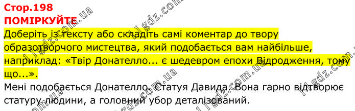 ПОМІРКУЙТЕ Доберіть із тексту або складіть самі коментар до твору образотворчого мистецтва, який подобається вам найбільше, наприклад: «Твір Донателло... є шедевром епохи Відродження, тому що...». Мені подобається Донателло. Статуя Давида. Вона гарно відтворює статуру людини, а головний убор деталізований.