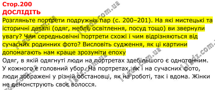 ДОСЛІДІТЬ Розгляньте портрети подружніх пар (с. 200–201). На які мистецькі та історичні деталі (одяг, меблі, освітлення, посуд тощо) ви звернули увагу? Чим середньовічні портрети схожі і чим відрізняються від сучасних родинних фото? Висловіть судження, як ці картини допомагають нам краще зрозуміти епоху Одяг, в якій одягнуті люди на портретах здебільшого є однотонним. У кожного є головний убор. На портретах, як і на сучасних фото, люди зображені у різній обстановці, як на роботі, так і вдома. Жінки не демонструють своє волосся.