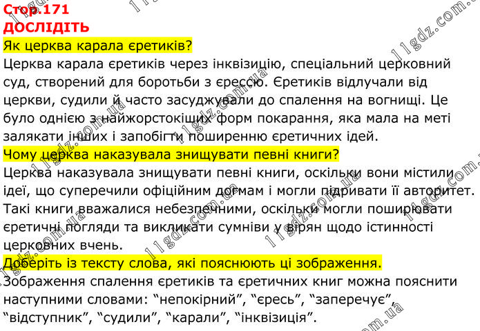 ДОСЛІДІТЬ Як церква карала єретиків? Церква карала єретиків через інквізицію, спеціальний церковний суд, створений для боротьби з єрессю. Єретиків відлучали від церкви, судили й часто засуджували до спалення на вогнищі. Це було однією з найжорстокіших форм покарання, яка мала на меті залякати інших і запобігти поширенню єретичних ідей. Чому церква наказувала знищувати певні книги? Церква наказувала знищувати певні книги, оскільки вони містили ідеї, що суперечили офіційним догмам і могли підривати її авторитет. Такі книги вважалися небезпечними, оскільки могли поширювати єретичні погляди та викликати сумніви у вірян щодо істинності церковних вчень. Доберіть із тексту слова, які пояснюють ці зображення. Зображення спалення єретиків та єретичних книг можна пояснити наступними словами: “непокірний”, “єресь”, “заперечує”, “відступник”, “судили”, “карали”, “інквізиція”.