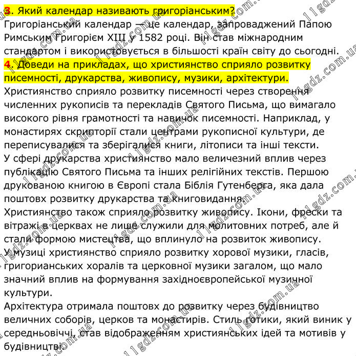 3. Який календар називають григоріанським? Григоріанський календар — це календар, запроваджений Папою Римським Григорієм XIII у 1582 році. Він став міжнародним стандартом і використовується в більшості країн світу до сьогодні. 4. Доведи на прикладах, що християнство сприяло розвитку писемності, друкарства, живопису, музики, архітектури. Християнство сприяло розвитку писемності через створення численних рукописів та перекладів Святого Письма, що вимагало високого рівня грамотності та навичок писемності. Наприклад, у монастирях скрипторії стали центрами рукописної культури, де переписувалися та зберігалися книги, літописи та інші тексти. У сфері друкарства християнство мало величезний вплив через публікацію Святого Письма та інших релігійних текстів. Першою друкованою книгою в Європі стала Біблія Гутенберга, яка дала поштовх розвитку друкарства та книговидання. Християнство також сприяло розвитку живопису. Ікони, фрески та вітражі в церквах не лише служили для молитовних потреб, але й стали формою мистецтва, що вплинуло на розвиток живопису. У музиці християнство сприяло розвитку хорової музики, гласів, григорианських хоралів та церковної музики загалом, що мало значний вплив на формування західноєвропейської музичної культури. Архітектура отримала поштовх до розвитку через будівництво величних соборів, церков та монастирів. Стиль готики, який виник у середньовіччі, став відображенням християнських ідей та мотивів у будівництві.