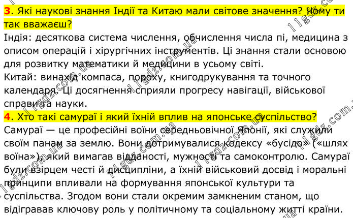 3. Які наукові знання Індії та Китаю мали світове значення? Чому ти так вважаєш? Індія: десяткова система числення, обчислення числа пі, медицина з описом операцій і хірургічних інструментів. Ці знання стали основою для розвитку математики й медицини в усьому світі. Китай: винахід компаса, пороху, книгодрукування та точного календаря. Ці досягнення сприяли прогресу навігації, військової справи та науки. 4. Хто такі самураї і який їхній вплив на японське суспільство? Самураї — це професійні воїни середньовічної Японії, які служили своїм панам за землю. Вони дотримувалися кодексу «бусідо» («шлях воїна»), який вимагав відданості, мужності та самоконтролю. Самураї були взірцем честі й дисципліни, а їхній військовий досвід і моральні принципи впливали на формування японської культури та суспільства. Згодом вони стали окремим замкненим станом, що відігравав ключову роль у політичному та соціальному житті країни.