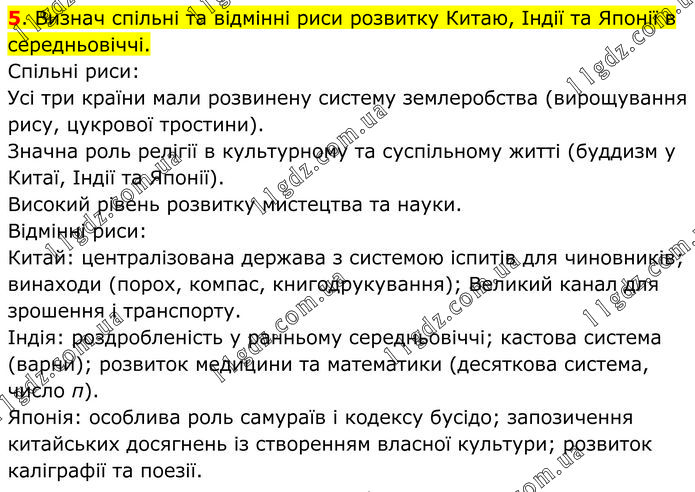 Визнач спільні та відмінні риси розвитку Китаю, Індії та Японії в середньовіччі. Спільні риси: Усі три країни мали розвинену систему землеробства (вирощування рису, цукрової тростини). Значна роль релігії в культурному та суспільному житті (буддизм у Китаї, Індії та Японії). Високий рівень розвитку мистецтва та науки. Відмінні риси: Китай: централізована держава з системою іспитів для чиновників; винаходи (порох, компас, книгодрукування); Великий канал для зрошення і транспорту. Індія: роздробленість у ранньому середньовіччі; кастова система (варни); розвиток медицини та математики (десяткова система, число π). Японія: особлива роль самураїв і кодексу бусідо; запозичення китайських досягнень із створенням власної культури; розвиток каліграфії та поезії.