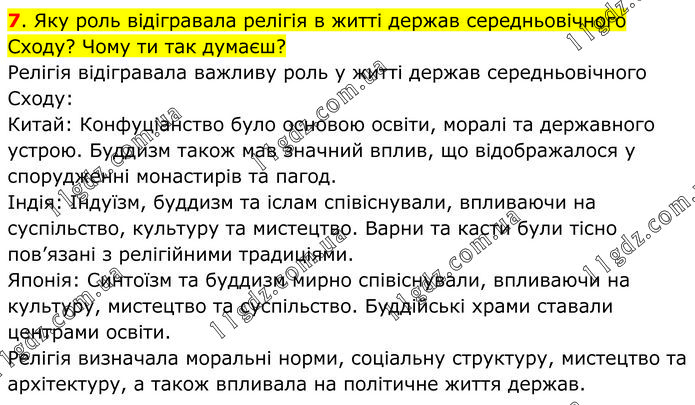 Яку роль відігравала релігія в житті держав середньовічного Сходу? Чому ти так думаєш? Релігія відігравала важливу роль у житті держав середньовічного Сходу: Китай: Конфуціанство було основою освіти, моралі та державного устрою. Буддизм також мав значний вплив, що відображалося у спорудженні монастирів та пагод. Індія: Індуїзм, буддизм та іслам співіснували, впливаючи на суспільство, культуру та мистецтво. Варни та касти були тісно пов’язані з релігійними традиціями. Японія: Синтоїзм та буддизм мирно співіснували, впливаючи на культуру, мистецтво та суспільство. Буддійські храми ставали центрами освіти. Релігія визначала моральні норми, соціальну структуру, мистецтво та архітектуру, а також впливала на політичне життя держав.