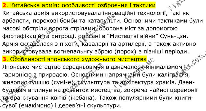 2. Китайська армія: особливості озброєння і тактики Китайська армія використовувала інноваційні технології, такі як арбалети, порохові бомби та катапульти. Основними тактиками були масові обстріли ворога стрілами, оборона міст за допомогою фортифікацій та хитрощі, описані в “Мистецтві війни” Сунь-цзи. Армія складалася з піхоти, кавалерії та артилерії, а також активно використовувала вогнепальнгу зброю (порох) в пізніші періоди. 3. Особливості японського художнього мистецтва Японське мистецтво середньовіччя відзначалося мінімалізмом і гармонією з природою. Основними напрямками були каліграфія, живопис тушшю (сумі-е), скульптура та архітектура храмів. Дзен-буддизм вплинув на розвиток мистецтва, зокрема чайної церемонії та аранжування квітів (ікебана). Також популярними були книги-сувої (емакімоно) і дерев’яні скульптури.