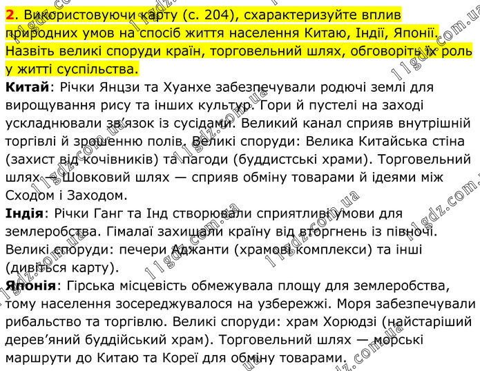 Використовуючи карту (c. 204), схарактеризуйте вплив природних умов на спосіб життя населення Китаю, Індії, Японії. Назвіть великі споруди країн, торговельний шлях, обговоріть їх роль у житті суспільства. Китай: Річки Янцзи та Хуанхе забезпечували родючі землі для вирощування рису та інших культур. Гори й пустелі на заході ускладнювали зв’язок із сусідами. Великий канал сприяв внутрішній торгівлі й зрошенню полів. Великі споруди: Велика Китайська стіна (захист від кочівників) та пагоди (буддистські храми). Торговельний шлях — Шовковий шлях — сприяв обміну товарами й ідеями між Сходом і Заходом. Індія: Річки Ганг та Інд створювали сприятливі умови для землеробства. Гімалаї захищали країну від вторгнень із півночі. Великі споруди: печери Аджанти (храмові комплекси) та інші (дивіться карту). Японія: Гірська місцевість обмежувала площу для землеробства, тому населення зосереджувалося на узбережжі. Моря забезпечували рибальство та торгівлю. Великі споруди: храм Хорюдзі (найстаріший дерев’яний буддійський храм). Торговельний шлях — морські маршрути до Китаю та Кореї для обміну товарами.