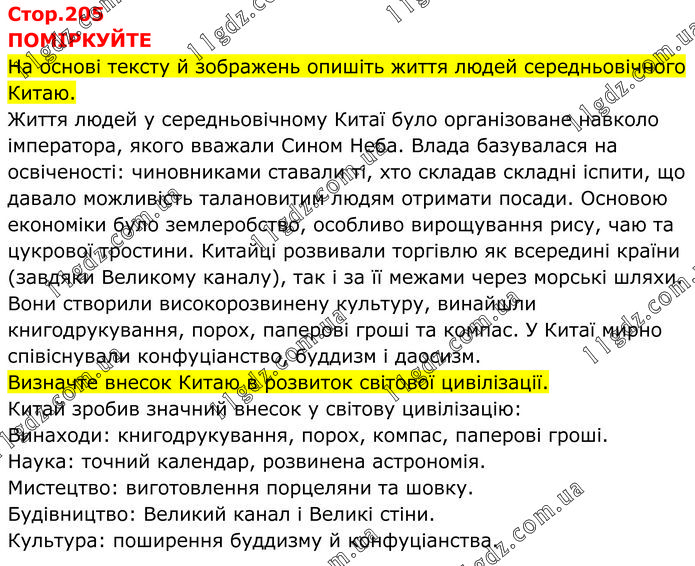 ПОМІРКУЙТЕ На основі тексту й зображень опишіть життя людей середньовічного Китаю. Життя людей у середньовічному Китаї було організоване навколо імператора, якого вважали Сином Неба. Влада базувалася на освіченості: чиновниками ставали ті, хто складав складні іспити, що давало можливість талановитим людям отримати посади. Основою економіки було землеробство, особливо вирощування рису, чаю та цукрової тростини. Китайці розвивали торгівлю як всередині країни (завдяки Великому каналу), так і за її межами через морські шляхи. Вони створили високорозвинену культуру, винайшли книгодрукування, порох, паперові гроші та компас. У Китаї мирно співіснували конфуціанство, буддизм і даосизм. Визначте внесок Китаю в розвиток світової цивілізації. Китай зробив значний внесок у світову цивілізацію: Винаходи: книгодрукування, порох, компас, паперові гроші. Наука: точний календар, розвинена астрономія. Мистецтво: виготовлення порцеляни та шовку. Будівництво: Великий канал і Великі стіни. Культура: поширення буддизму й конфуціанства.