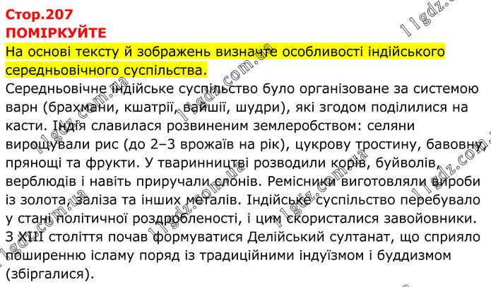 ПОМІРКУЙТЕ На основі тексту й зображень визначте особливості індійського середньовічного суспільства. Середньовічне індійське суспільство було організоване за системою варн (брахмани, кшатрії, вайшії, шудри), які згодом поділилися на касти. Індія славилася розвиненим землеробством: селяни вирощували рис (до 2–3 врожаїв на рік), цукрову тростину, бавовну, прянощі та фрукти. У тваринництві розводили корів, буйволів, верблюдів і навіть приручали слонів. Ремісники виготовляли вироби із золота, заліза та інших металів. Індійське суспільство перебувало у стані політичної роздробленості, і цим скористалися завойовники. З XIII століття почав формуватися Делійський султанат, що сприяло поширенню ісламу поряд із традиційними індуїзмом і буддизмом (збіргалися).