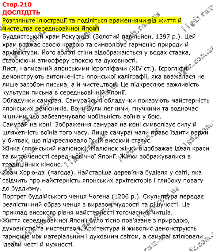 ДОСЛІДІТЬ Розгляньте ілюстрації та поділіться враженнями від життя й мистецтва середньовічної Японії Буддистський храм Рокуондзі (Золотий павільйон, 1397 р.). Цей храм вражає своєю красою та символізує гармонію природи й архітектури. Його золоті стіни відображаються у водах ставка, створюючи атмосферу спокою та духовності. Лист, написаний японськими ієрогліфами (ХІV ст.). Ієрогліфи демонструють витонченість японської каліграфії, яка вважалася не лише засобом письма, а й мистецтвом. Це підкреслює важливість культури письма в середньовічній Японії. Обладунки самурая. Самурайські обладунки показують майстерність японських ремісників. Вони були легкими, гнучкими та водночас міцними, що забезпечувало мобільність воїнів у бою. Самурай на коні. Зображення самурая на коні символізує силу й шляхетність воїнів того часу. Лише самураї мали право їздити верхи у битвах, що підкреслювало їхній високий статус. Жінка (японський малюнок). Малюнок жінки відображає ідеал краси та витонченості середньовічної Японії. Жінки зображувалися в традиційних кімоно. Храм Хорю-дзі (пагода). Найстаріша дерев’яна будівля у світі, яка свідчить про майстерність японських архітекторів і глибоку повагу до буддизму. Портрет буддійського ченця Чогена (1206 р.). Скульптура передає реалістичний образ ченця з виразом мудрості та рішучості. Це приклад високого рівня майстерності тогочасних митців. Життя середньовічної Японії було тісно пов’язане з природою, духовністю та мистецтвом. Архітектура й живопис демонструють гармонію між матеріальним і духовним світом, а самураї втілювали ідеали честі й мужності.