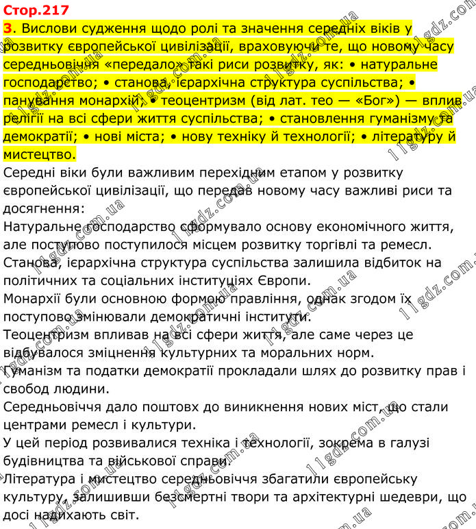 Вислови судження щодо ролі та значення середніх віків у розвитку європейської цивілізації, враховуючи те, що новому часу середньовіччя «передало» такі риси розвитку, як: • натуральне господарство; • станова, ієрархічна структура суспільства; • панування монархій; • теоцентризм (від лат. тео — «Бог») — вплив релігії на всі сфери життя суспільства; • становлення гуманізму та демократії; • нові міста; • нову техніку й технології; • літературу й мистецтво. Середні віки були важливим перехідним етапом у розвитку європейської цивілізації, що передав новому часу важливі риси та досягнення: Натуральне господарство сформувало основу економічного життя, але поступово поступилося місцем розвитку торгівлі та ремесл. Станова, ієрархічна структура суспільства залишила відбиток на політичних та соціальних інституціях Європи. Монархії були основною формою правління, однак згодом їх поступово змінювали демократичні інститути. Теоцентризм впливав на всі сфери життя, але саме через це відбувалося зміцнення культурних та моральних норм. Гуманізм та податки демократії прокладали шлях до розвитку прав і свобод людини. Середньовіччя дало поштовх до виникнення нових міст, що стали центрами ремесл і культури. У цей період розвивалися техніка і технології, зокрема в галузі будівництва та військової справи. Література і мистецтво середньовіччя збагатили європейську культуру, залишивши безсмертні твори та архітектурні шедеври, що досі надихають світ.