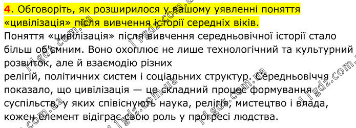 Обговоріть, як розширилося у вашому уявленні поняття «цивілізація» після вивчення історії середніх віків. Поняття «цивілізація» після вивчення середньовічної історії стало більш об'ємним. Воно охоплює не лише технологічний та культурний розвиток, але й взаємодію різних релігій, політичних систем і соціальних структур. Середньовіччя показало, що цивілізація — це складний процес формування суспільств, у яких співіснують наука, релігія, мистецтво і влада, кожен елемент відіграє свою роль у прогресі людства.