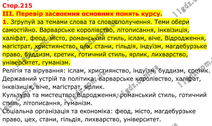 III. Перевір засвоєння основних понять курсу. 1. Згрупуй за темами слова та словосполучення. Теми обери самостійно. Варварське королівство, літописання, інквізиція, халіфат, феод, місто, романський стиль, іслам, віче, Відродження, магістрат, християнство, цех, стани, гільдія, індуїзм, магдебурзьке право, буддизм, єретик, готичний стиль, ярлик, лихварство, університет, гуманізм. Релігія та вірування: іслам, християнство, індуїзм, буддизм, єретик. Державний устрій та політика: варварське королівство, халіфат, інквізиція, віче, магістрат, ярлик. Культура та мистецтво: Відродження, романський стиль, готичний стиль, літописання, гуманізм. Соціальна організація та економіка: феод, місто, магдебурзьке право, цех, стани, гільдія, лихварство, університет.