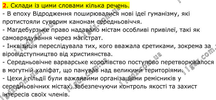 2. Склади із цими словами кілька речень. - В епоху Відродження поширювалися нові ідеї гуманізму, які протистояли суворим канонам середньовіччя. - Магдебурзьке право надавало містам особливі привілеї, такі як самоврядування через магістрат. - Інквізиція переслідувала тих, кого вважала єретиками, зокрема за віровідступництво від християнства. - Середньовічне варварське королівство поступово перетворювалося в могутній халіфат, що панував над великими територіями. - Цехи і гільдії були важливими організаціями ремісників у середньовічних містах, забезпечуючи контроль якості та захист інтересів своїх членів.