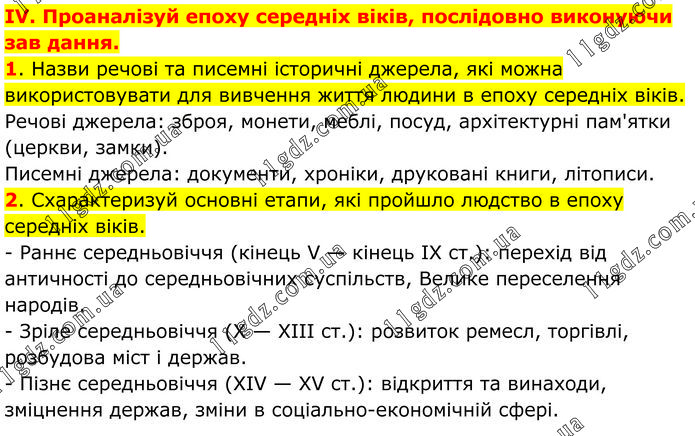 IV. Проаналізуй епоху середніх віків, послідовно виконуючи зав дання. 1. Назви речові та писемні історичні джерела, які можна використовувати для вивчення життя людини в епоху середніх віків. Речові джерела: зброя, монети, меблі, посуд, архітектурні пам'ятки (церкви, замки). Писемні джерела: документи, хроніки, друковані книги, літописи. 2. Схарактеризуй основні етапи, які пройшло людство в епоху середніх віків. - Раннє середньовіччя (кінець V — кінець IX ст.): перехід від античності до середньовічних суспільств, Велике переселення народів. - Зріле середньовіччя (X — XIII ст.): розвиток ремесл, торгівлі, розбудова міст і держав. - Пізнє середньовіччя (XIV — XV ст.): відкриття та винаходи, зміцнення держав, зміни в соціально-економічній сфері.