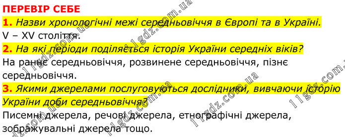 ПЕРЕВІР СЕБЕ 1. Назви хронологічні межі середньовіччя в Європі та в Україні. V – XV століття. 2. На які періоди поділяється історія України середніх віків? На раннє середньовіччя, розвинене середньовіччя, пізнє середньовіччя. 3. Якими джерелами послуговуються дослідники, вивчаючи історію України доби середньовіччя? Писемні джерела, речові джерела, етнографічні джерела, зображувальні джерела тощо.