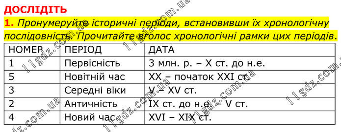 ДОСЛІДІТЬ 1. Пронумеруйте історичні періоди, встановивши їх хронологічну послідовність. Прочитайте вголос хронологічні рамки цих періодів. НОМЕР ПЕРІОД ДАТА 1 Первісність 3 млн. р. – Х ст. до н.е. 5 Новітній час ХХ – початок ХХІ ст. 3 Середні віки V – XV ст. 2 Античність ІХ ст. до н.е. – V ст. 4 Новий час ХVI – ХІХ ст.