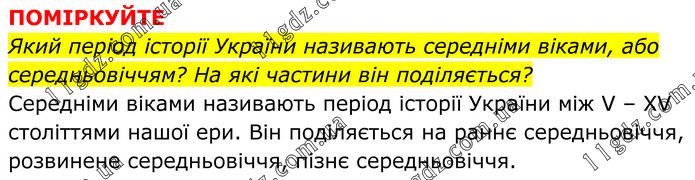 ПОМІРКУЙТЕ Який період історії України називають середніми віками, або середньовіччям? На які частини він поділяється? Середніми віками називають період історії України між V – XV століттями нашої ери. Він поділяється на раннє середньовіччя, розвинене середньовіччя, пізнє середньовіччя.