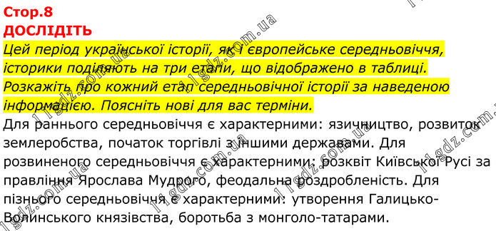 ДОСЛІДІТЬ Цей період української історії, як і європейське середньовіччя, історики поділяють на три етапи, що відображено в таблиці. Розкажіть про кожний етап середньовічної історії за наведеною інформацією. Поясніть нові для вас терміни. Для раннього середньовіччя є характерними: язичництво, розвиток землеробства, початок торгівлі з іншими державами. Для розвиненого середньовіччя є характерними: розквіт Київської Русі за правління Ярослава Мудрого, феодальна роздробленість. Для пізнього середньовіччя є характерними: утворення Галицько-Волинського князівства, боротьба з монголо-татарами.