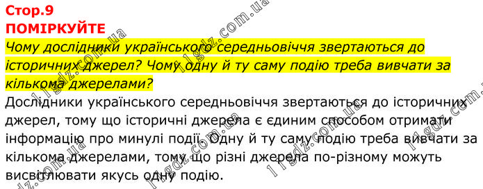 ПОМІРКУЙТЕ Чому дослідники українського середньовіччя звертаються до історичних джерел? Чому одну й ту саму подію треба вивчати за кількома джерелами? Дослідники українського середньовіччя звертаються до історичних джерел, тому що історичні джерела є єдиним способом отримати інформацію про минулі події. Одну й ту саму подію треба вивчати за кількома джерелами, тому що різні джерела по-різному можуть висвітлювати якусь одну подію.