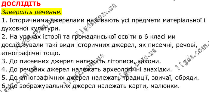 ДОСЛІДІТЬ Завершіть речення. 1. Історичними джерелами називають усі предмети матеріальної і духовної культури. 2. На уроках історії та громадянської освіти в 6 класі ми досліджували такі види історичних джерел, як писемні, речові, етнографічні тощо. 3. До писемних джерел належать літописи, закони. 4. До речових джерел належать археологічні знахідки. 5. До етнографічних джерел належать традиції, звичаї, обряди. 6. До зображувальних джерел належать карти, малюнки.
