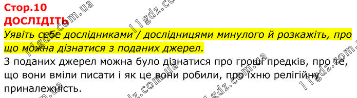 ДОСЛІДІТЬ Уявіть себе дослідниками / дослідницями минулого й розкажіть, про що можна дізнатися з поданих джерел. З поданих джерел можна було дізнатися про гроші предків, про те, що вони вміли писати і як це вони робили, про їхню релігійну приналежність.