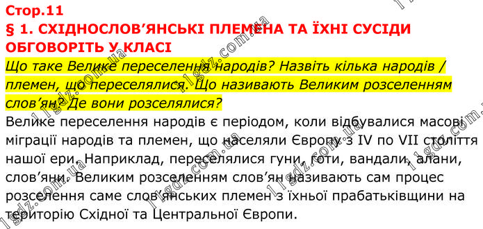 § 1. СХІДНОСЛОВ’ЯНСЬКІ ПЛЕМЕНА ТА ЇХНІ СУСІДИ ОБГОВОРІТЬ У КЛАСІ Що таке Велике переселення народів? Назвіть кілька народів / племен, що переселялися. Що називають Великим розселенням слов’ян? Де вони розселялися? Велике переселення народів є періодом, коли відбувалися масові міграції народів та племен, що населяли Європу з IV по VII століття нашої ери. Наприклад, переселялися гуни, готи, вандали, алани, слов’яни. Великим розселенням слов’ян називають сам процес розселення саме слов’янських племен з їхньої прабатьківщини на територію Східної та Центральної Європи.