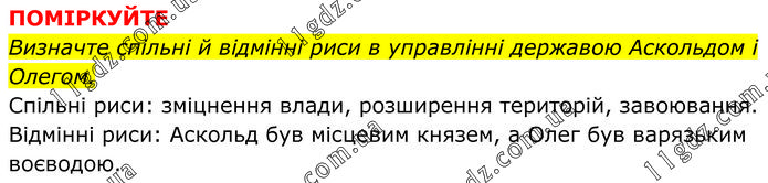 ПОМІРКУЙТЕ Визначте спільні й відмінні риси в управлінні державою Аскольдом і Олегом. Спільні риси: зміцнення влади, розширення територій, завоювання. Відмінні риси: Аскольд був місцевим князем, а Олег був варязьким воєводою.