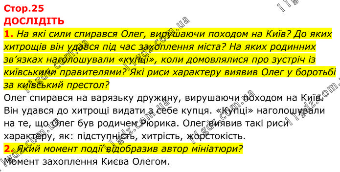 ДОСЛІДІТЬ 1. На які сили спирався Олег, вирушаючи походом на Київ? До яких хитрощів він удався під час захоплення міста? На яких родинних зв’язках наголошували «купці», коли домовлялися про зустріч із київськими правителями? Які риси характеру виявив Олег у боротьбі за київський престол? Олег спирався на варязьку дружину, вирушаючи походом на Київ. Він удався до хитрощі видати з себе купця. «Купці» наголошували на те, що Олег був родичем Рюрика. Олег виявив такі риси характеру, як: підступність, хитрість, жорстокість. 2. Який момент події відобразив автор мініатюри? Момент захоплення Києва Олегом.