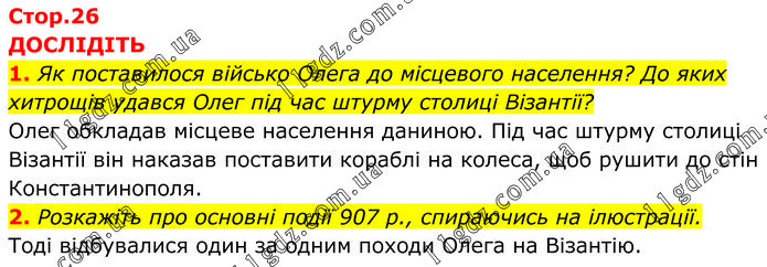 ДОСЛІДІТЬ 1. Як поставилося військо Олега до місцевого населення? До яких хитрощів удався Олег під час штурму столиці Візантії? Олег обкладав місцеве населення даниною. Під час штурму столиці Візантії він наказав поставити кораблі на колеса, щоб рушити до стін Константинополя. 2. Розкажіть про основні події 907 р., спираючись на ілюстрації. Тоді відбувалися один за одним походи Олега на Візантію.