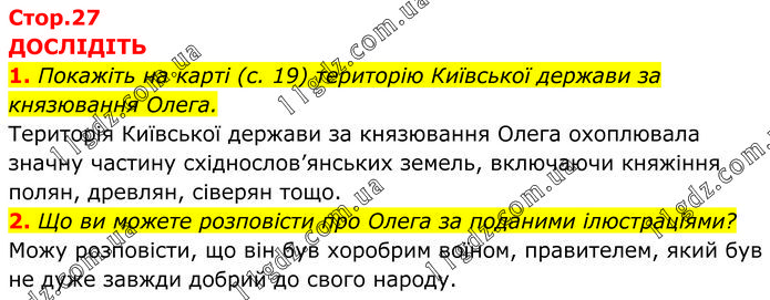 ДОСЛІДІТЬ 1. Покажіть на карті (с. 19) територію Київської держави за князювання Олега. Територія Київської держави за князювання Олега охоплювала значну частину східнослов’янських земель, включаючи княжіння полян, древлян, сіверян тощо. 2. Що ви можете розповісти про Олега за поданими ілюстраціями? Можу розповісти, що він був хоробрим воїном, правителем, який був не дуже завжди добрий до свого народу.