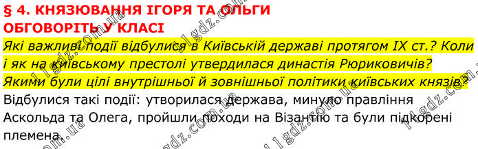 § 4. КНЯЗЮВАННЯ ІГОРЯ ТА ОЛЬГИ ОБГОВОРІТЬ У КЛАСІ Які важливі події відбулися в Київській державі протягом ІХ ст.? Коли і як на київському престолі утвердилася династія Рюриковичів? Якими були цілі внутрішньої й зовнішньої політики київських князів? Відбулися такі події: утворилася держава, минуло правління Аскольда та Олега, пройшли походи на Візантію та були підкорені племена.