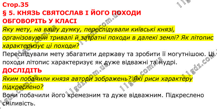 § 5. КНЯЗЬ СВЯТОСЛАВ І ЙОГО ПОХОДИ ОБГОВОРІТЬ У КЛАСІ Яку мету, на вашу думку, переслідували київські князі, організовуючи тривалі й затратні походи в далекі землі? Як літопис характеризує ці походи? Переслідували мету збагатити державу та зробити її могутнішою. Ці походи літопис характеризує як дуже відважні та мудрі. ДОСЛІДІТЬ Яким побачили князя автори зображень? Які риси характеру підкреслено? Вони побачили його кремезним та дуже відважним. Підкреслено сміливість.