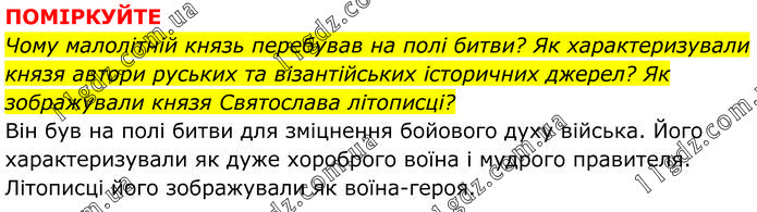 ПОМІРКУЙТЕ Чому малолітній князь перебував на полі битви? Як характеризували князя автори руських та візантійських історичних джерел? Як зображували князя Святослава літописці? Він був на полі битви для зміцнення бойового духу війська. Його характеризували як дуже хороброго воїна і мудрого правителя. Літописці його зображували як воїна-героя.