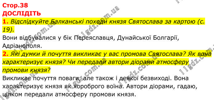 ДОСЛІДІТЬ 1. Відслідкуйте Балканські походи князя Святослава за картою (с. 19). Вони відбувалися у бік Переяславця, Дунайської Болгарії, Адріанополя. 2. Які думки й почуття викликає у вас промова Святослава? Як вона характеризує князя? Чи передали автори діорами атмосферу промови князя? Викликає почуття поваги, але також і деякої безвиході. Вона характеризує князя як хороброго воїна. Автори діорами, гадаю, цілком передали атмосферу промови князя.