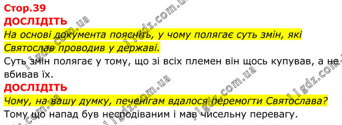 ДОСЛІДІТЬ На основі документа поясніть, у чому полягає суть змін, які Святослав проводив у державі. Суть змін полягає у тому, що зі всіх племен він щось купував, а не вбивав їх. ДОСЛІДІТЬ Чому, на вашу думку, печенігам вдалося перемогти Святослава? Тому що напад був несподіваним і мав чисельну перевагу.