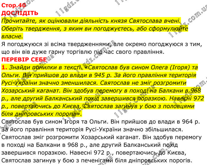 ДОСЛІДІТЬ Прочитайте, як оцінювали діяльність князя Святослава вчені. Оберіть твердження, з яким ви погоджуєтесь, або сформулюйте власне. Я погоджуюся зі всіма твердженнями, але окремо погоджуюся з тим, що він вів дуже гарну торгівлю під час свого правління. ПЕРЕВІР СЕБЕ 1. Знайди помилки в тексті. «Святослав був сином Олега (Ігоря) та Ольги. Він прийшов до влади в 945 р. За його правління територія Русі-України значно зменшилася. Святослав не зміг розгромити Хозарський каганат. Він здобув перемогу в поході на Балкани в 968 р., але другий Балканський похід завершився поразкою. Навесні 972 р., повертаючись до Києва, Святослав загинув у бою з половцями біля дніпровських порогів». Святослав був сином Ігоря та Ольги. Він прийшов до влади в 964 р. За його правління територія Русі-України значно збільшилася. Святослав зміг розгромити Хозарський каганат. Він здобув перемогу в поході на Балкани в 968 р., але другий Балканський похід завершився поразкою. Навесні 972 р., повертаючись до Києва, Святослав загинув у бою з печенігами біля дніпровських порогів.