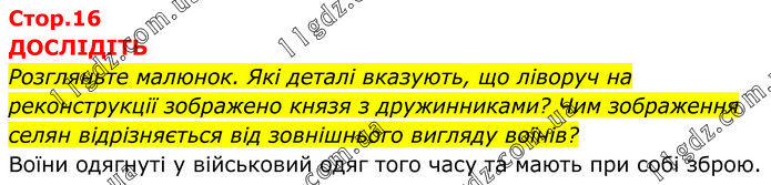 ДОСЛІДІТЬ Розгляньте малюнок. Які деталі вказують, що ліворуч на реконструкції зображено князя з дружинниками? Чим зображення селян відрізняється від зовнішнього вигляду воїнів? Воїни одягнуті у військовий одяг того часу та мають при собі зброю.
