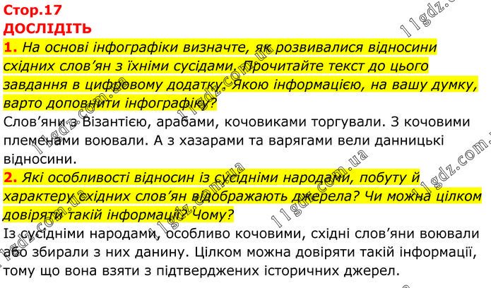 ДОСЛІДІТЬ 1. На основі інфографіки визначте, як розвивалися відносини східних слов’ян з їхніми сусідами. Прочитайте текст до цього завдання в цифровому додатку. Якою інформацією, на вашу думку, варто доповнити інфографіку? Слов’яни з Візантією, арабами, кочовиками торгували. З кочовими племенами воювали. А з хазарами та варягами вели данницькі відносини. 2. Які особливості відносин із сусідніми народами, побуту й характеру східних слов’ян відображають джерела? Чи можна цілком довіряти такій інформації? Чому? Із сусідніми народами, особливо кочовими, східні слов’яни воювали або збирали з них данину. Цілком можна довіряти такій інформації, тому що вона взяти з підтверджених історичних джерел.