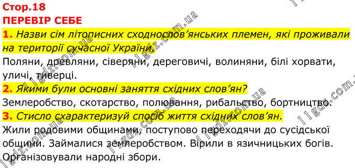 ПЕРЕВІР СЕБЕ 1. Назви сім літописних сходнослов’янських племен, які проживали на території сучасної України. Поляни, древляни, сіверяни, дереговичі, волиняни, білі хорвати, уличі, тиверці. 2. Якими були основні заняття східних слов’ян? Землеробство, скотарство, полювання, рибальство, бортництво. 3. Стисло схарактеризуй спосіб життя східних слов’ян. Жили родовими общинами, поступово переходячи до сусідської общини. Займалися землеробством. Вірили в язичницьких богів. Організовували народні збори.