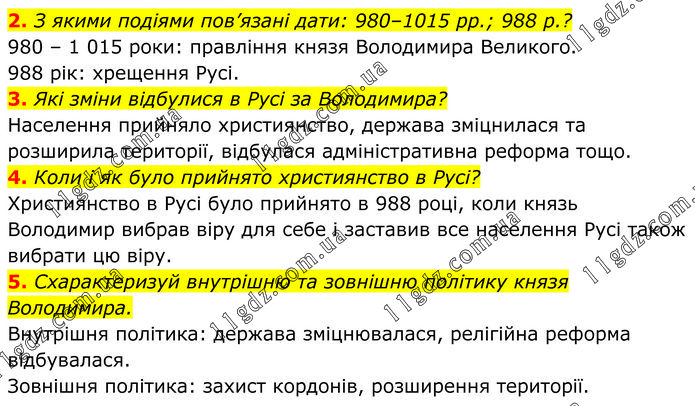 2. З якими подіями пов’язані дати: 980–1015 рр.; 988 р.? 980 – 1 015 роки: правління князя Володимира Великого. 988 рік: хрещення Русі. 3. Які зміни відбулися в Русі за Володимира? Населення прийняло християнство, держава зміцнилася та розширила території, відбулася адміністративна реформа тощо. 4. Коли і як було прийнято християнство в Русі? Християнство в Русі було прийнято в 988 році, коли князь Володимир вибрав віру для себе і заставив все населення Русі також вибрати цю віру. 5. Схарактеризуй внутрішню та зовнішню політику князя Володимира. Внутрішня політика: держава зміцнювалася, релігійна реформа відбувалася. Зовнішня політика: захист кордонів, розширення території.